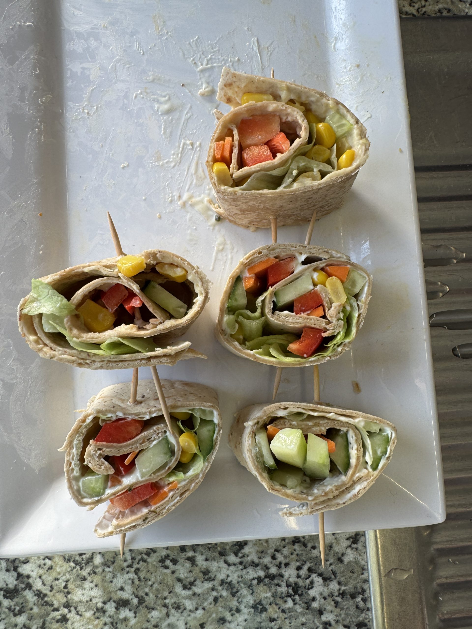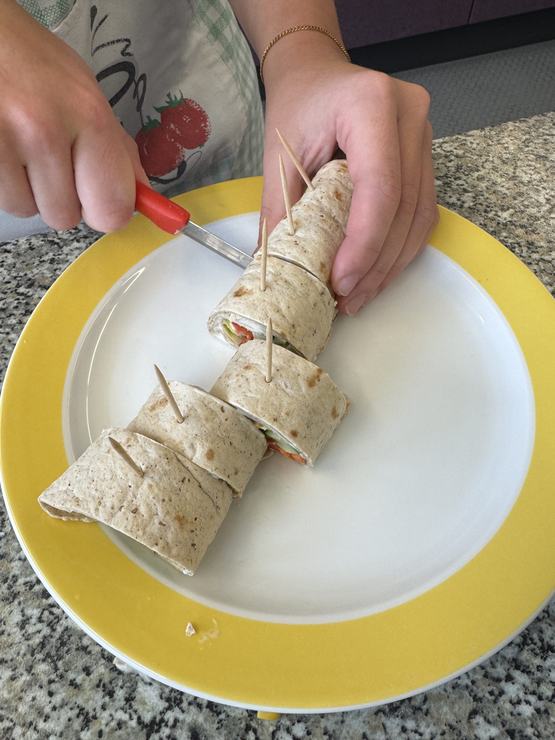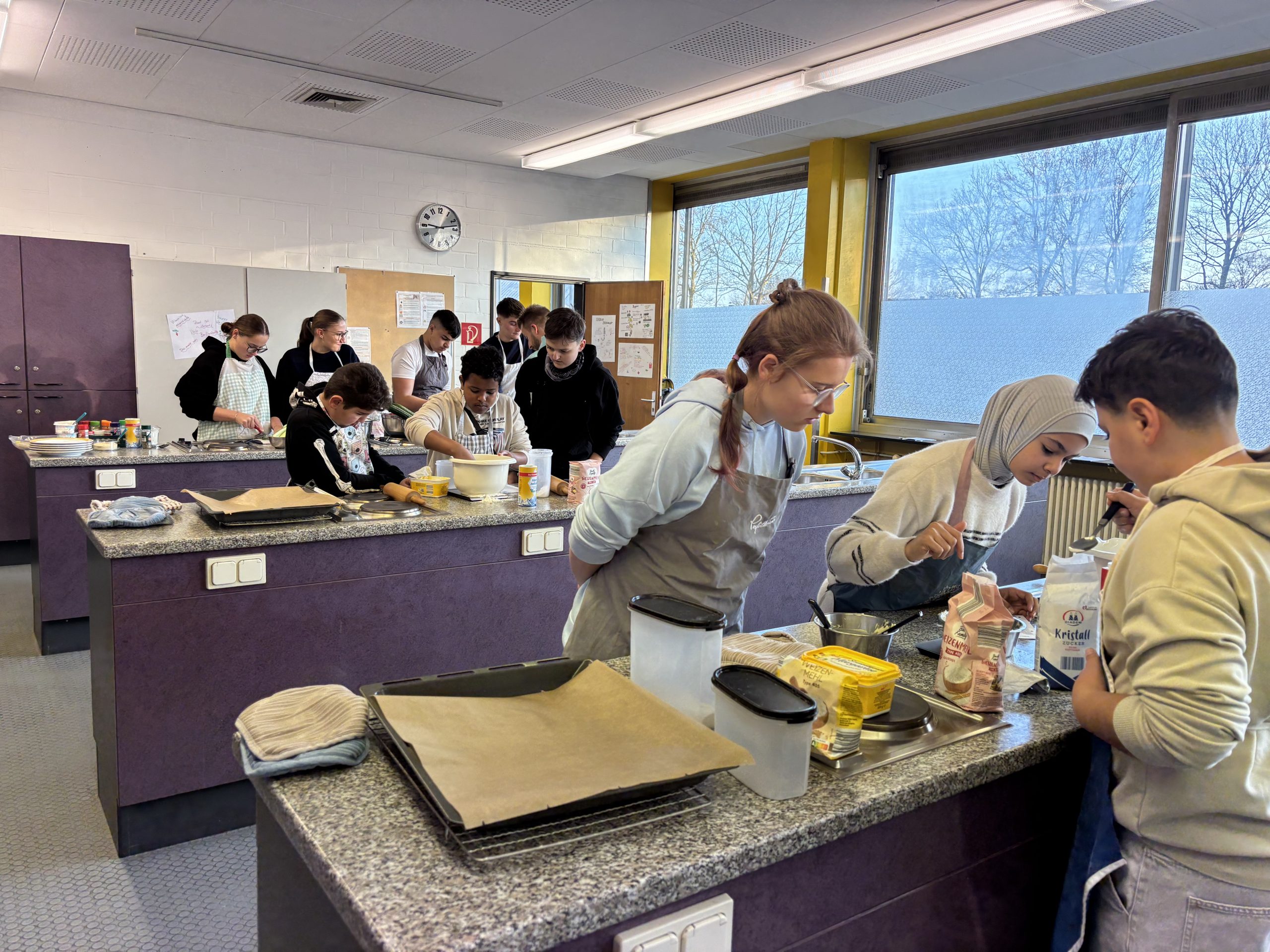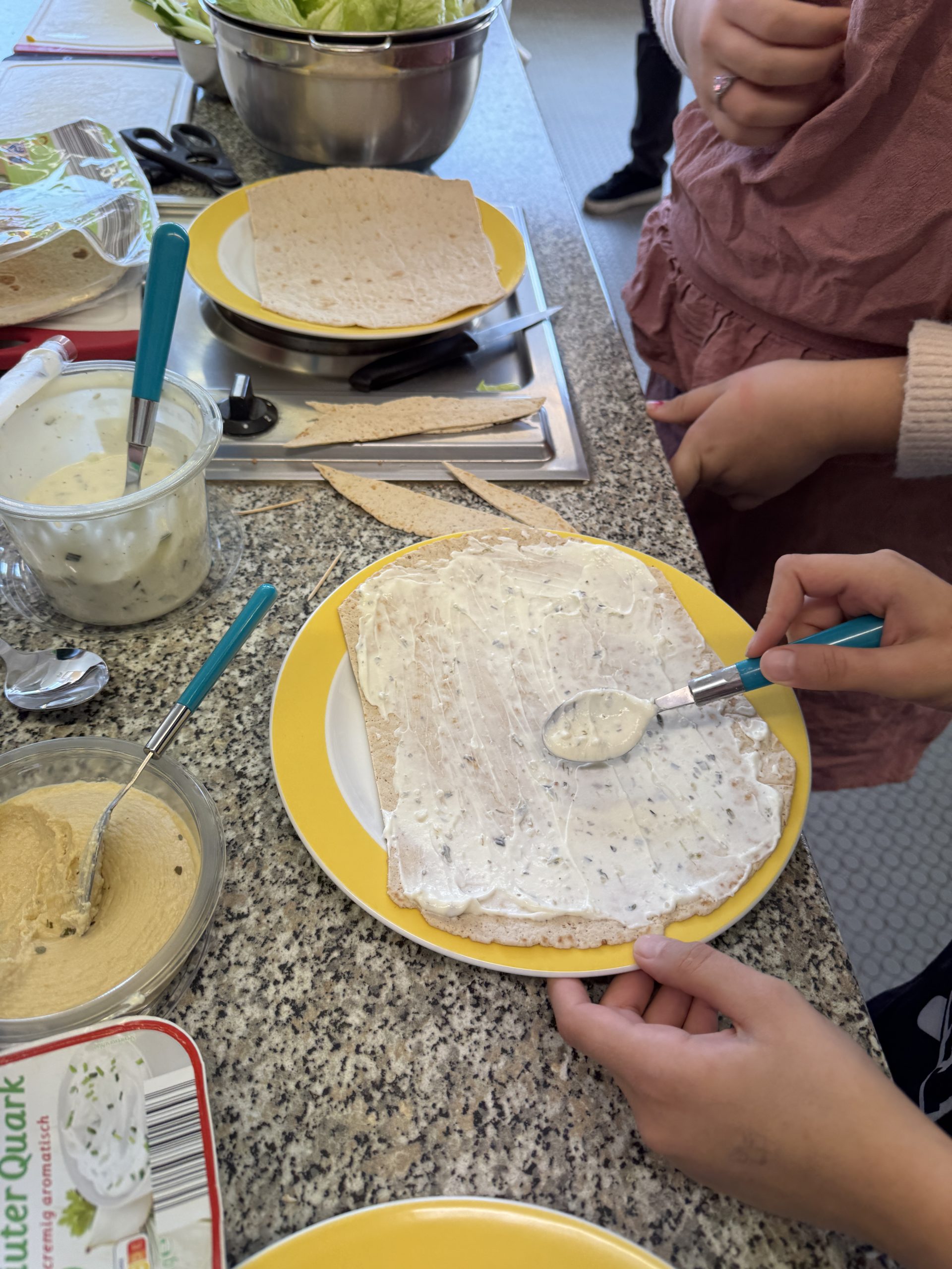 Die 7c half zusammen mit Schülerinnen und Schülern aus der Oberstufe dabei, in der Küche einen gesunden Schulsnack zuzubereiten: Der Gemüse-Wrap als gesundes Frühstück für die Brotdose.
