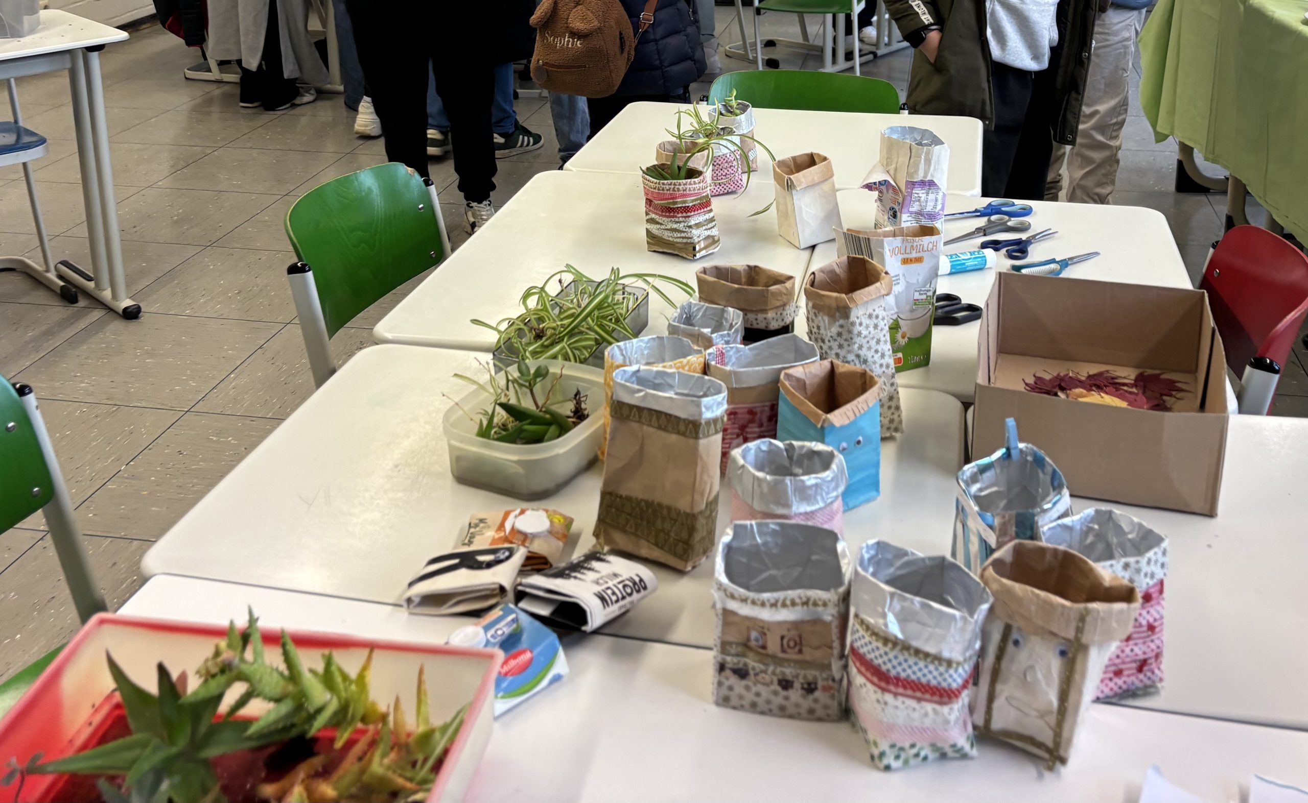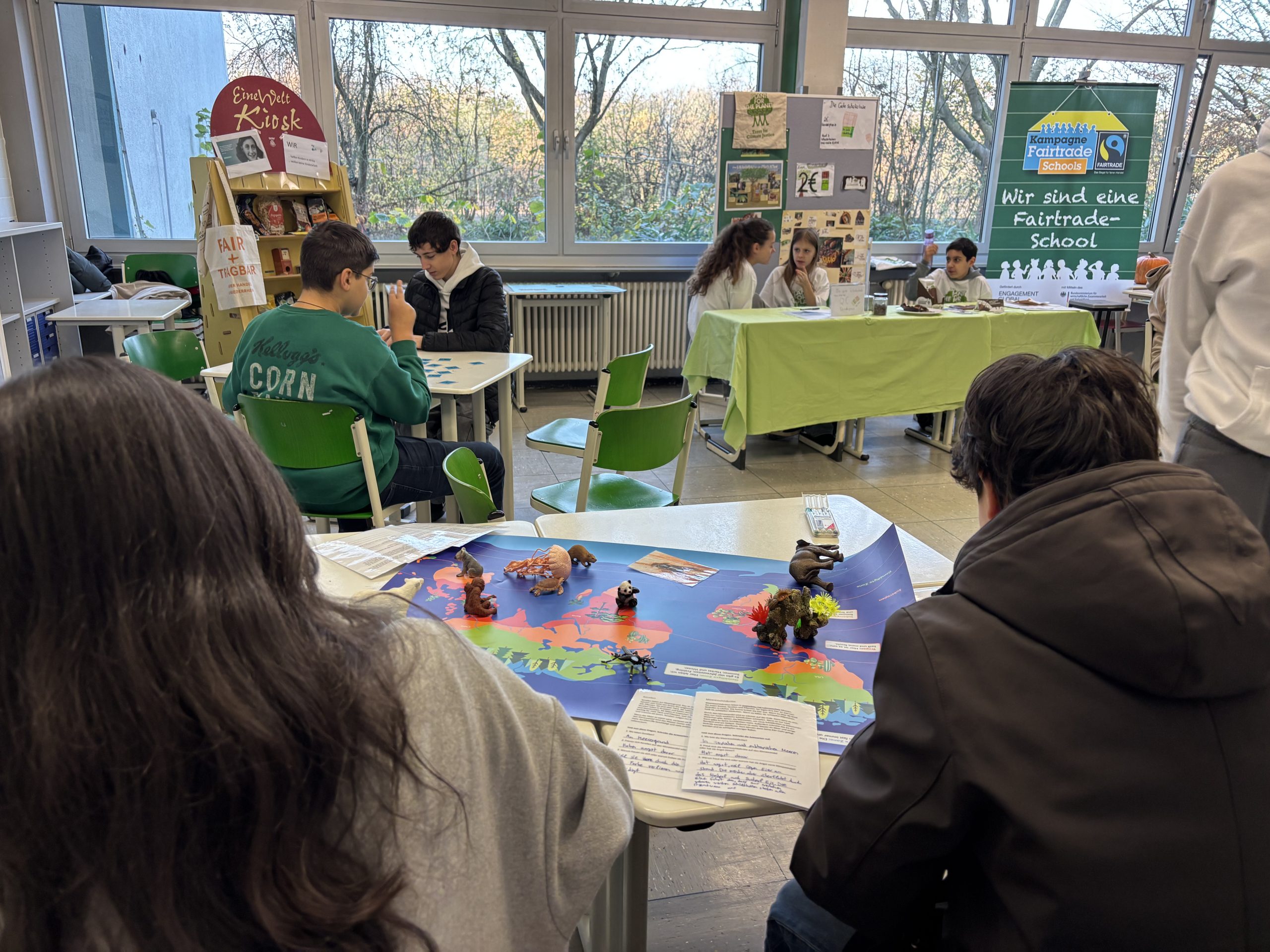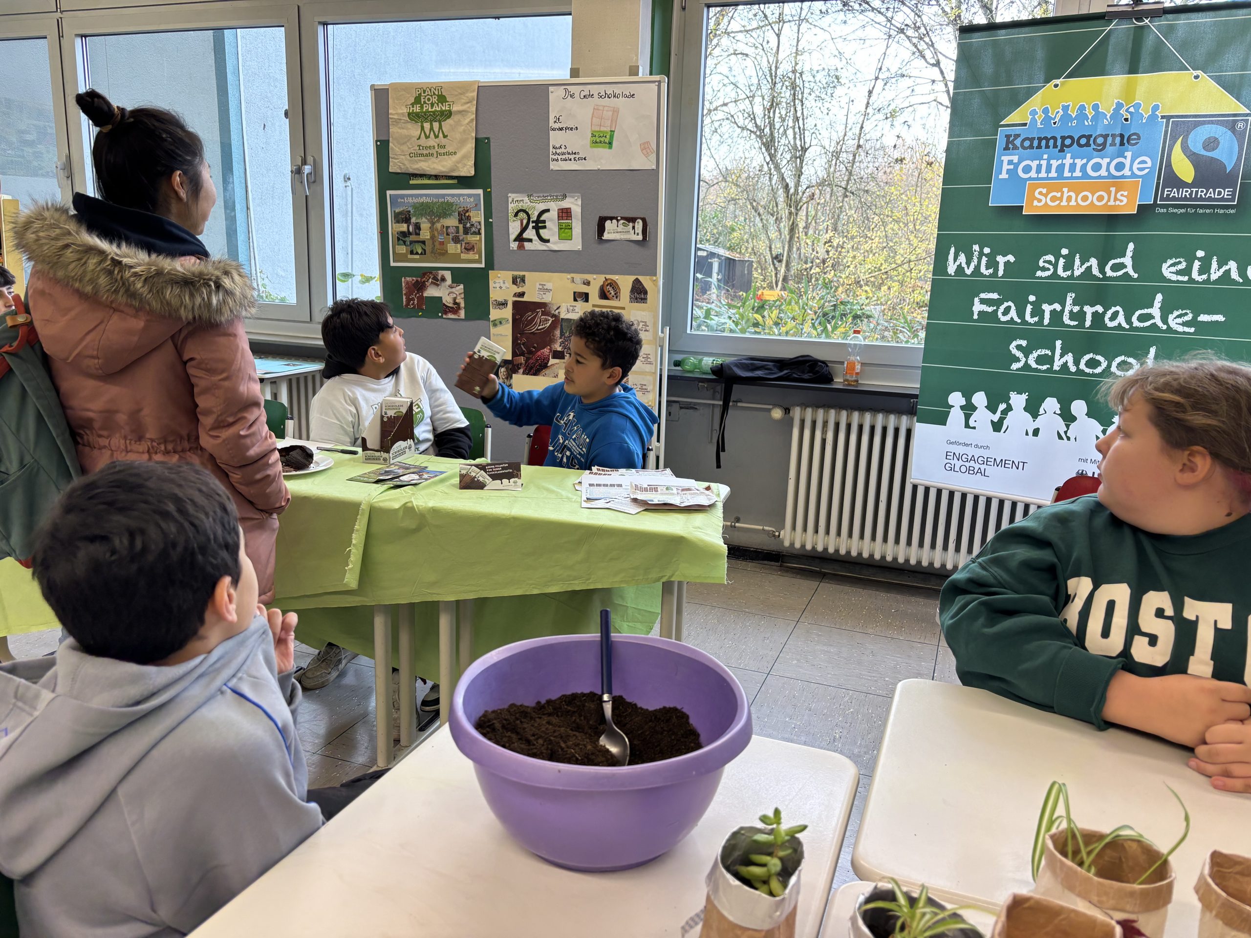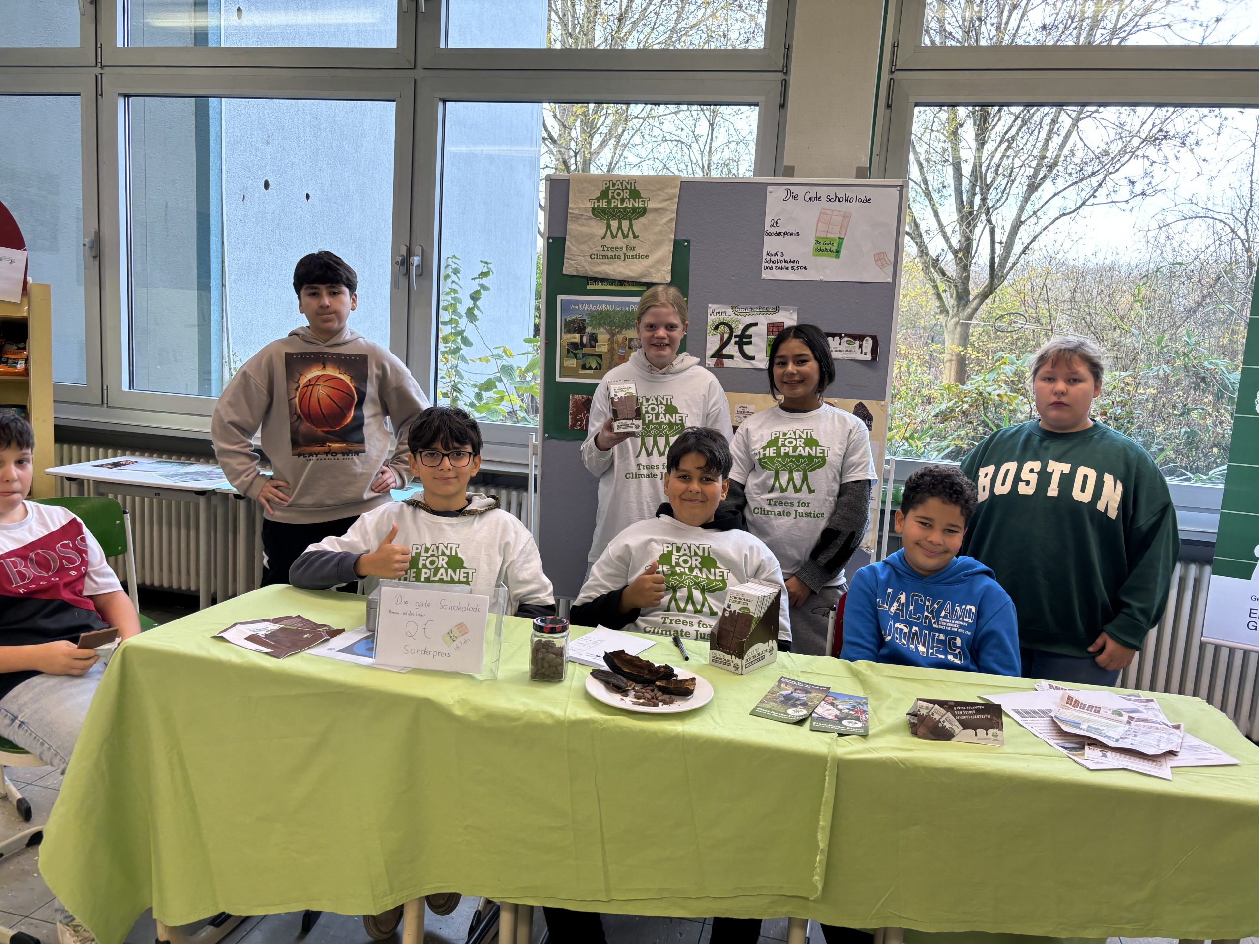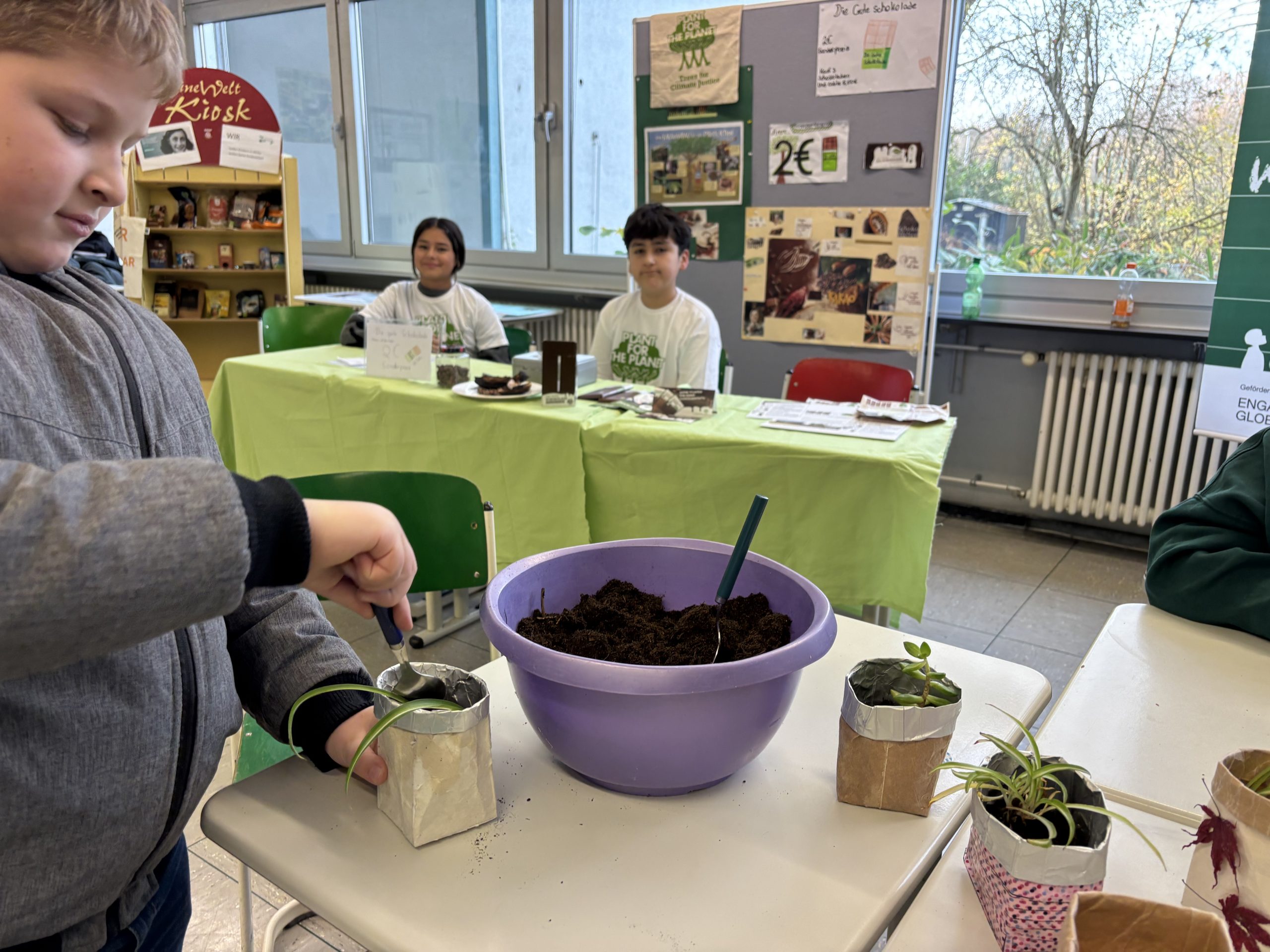 Die Schülerinnen und Schüler der Klasse 6c präsentierten das Projekt “Plant-for-the-Planet”. Neben den selbstgemachten Informationsplakaten, verkauften wir die GUTE Schokolade. Es gab ein Spiel zum Klimawandel sowie ein Memory zum Fairen Handel. Die Upcycling-Töpfe zum Einpflanzen der Zimmerpflanzen-Ableger konnten aus leeren Milch-Tetrapaks selbst hergestellt werden.
